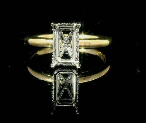 This stunning semi-mount holds a 2.0ct emerald, combining the warmth of 18k yellow gold and white gold. The intricate detailing of a hidden halo around the center adds a touch of sophistication, making it perfect...