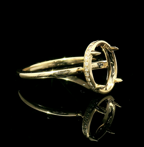 This semi-mount is crafted from 18k yellow gold holds a 2.00ct oval diamonds. The band is characterized by a smooth, polished finish, enhancing its reflective properties. The setting includes four prongs, which are designed to...