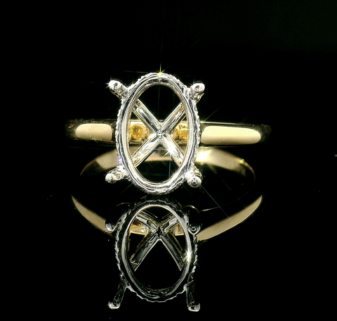 This stunning 18k yellow and white gold semi-mount holds a unique 3.0ct oval. Its intricate detailing and polished finish make it a perfect accessory for any occasion, whether casual or formal. Elevate your jewelry collection...