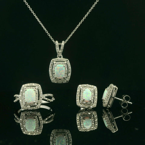 Indulge in the allure of this exquisite sterling silver charm set. Showcasing a necklace, earrings, and ring, it highlights a mesmerizing cushion opal gemstone, the charm radiates with iridescent flashes. This timeless piece effortlessly combines...