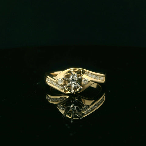 This exquisite .24 cttw multistone ring semi mount features a timeless design, crafted from radiant 14k yellow gold. The ring would showcase a brilliant round cut stone of your choice, complemented by smaller accent stones...