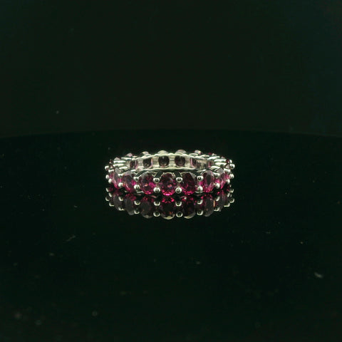 Exquisitely crafted in sterling silver, this enchanting eternity ring features a continuous array of round cut, brilliant cut dark pink gemstones. Carefully set to create a seamless circle of fire, perfect for symbolizing everlasting love...