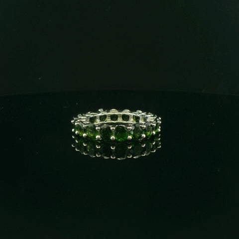 Exquisitely crafted in sterling silver, this enchanting eternity ring features a continuous array of round cut, brilliant cut dark green gemstones. Carefully set to create a seamless circle of fire, perfect for symbolizing everlasting love...