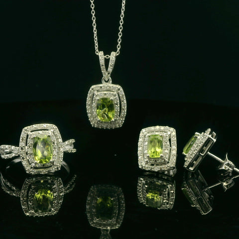 Spice up your look with this stunnign three piece set. This peridot and white zircon set in sterling silver features a necklace, earrings, and ring. The perfect pieces to dress up or elevate your daily...