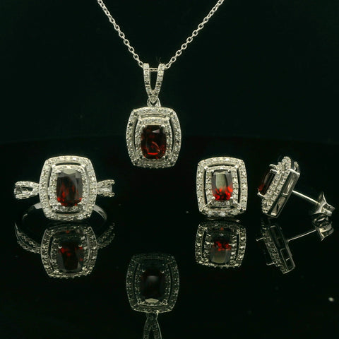 Add a bit of sparkle to your collection with this stunning three piece garnet set. Set in sterling silver, this set features a necklace, earrings, and ring with garnet and white zircon. The perfect piece...