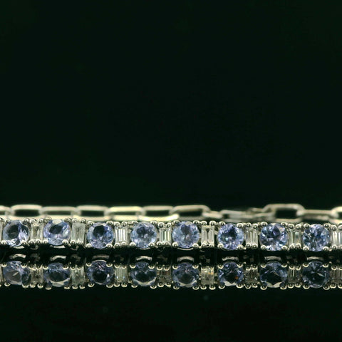 This captivating sterling silver tennis necklace displays a beautiful array of round cut tanzanite stones, a perfect gift for any occasion.