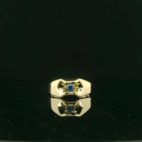 Exude timeless sophistication with this commanding 14k yellow gold signet ring. The design features a meticulously set, round-cut genuine YOGO sapphire exhibiting a brilliant cutting style and a mesmerizing royal blue hue. This ring is...