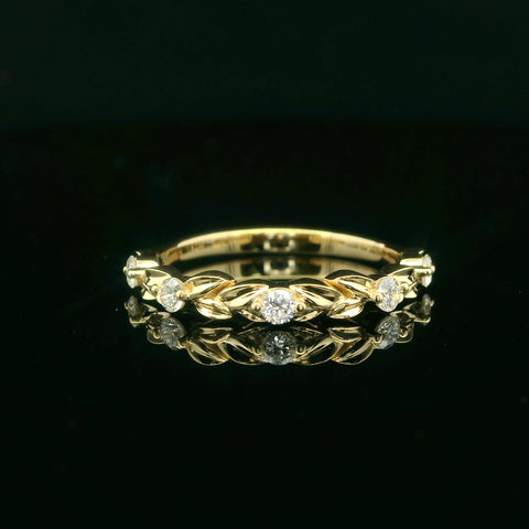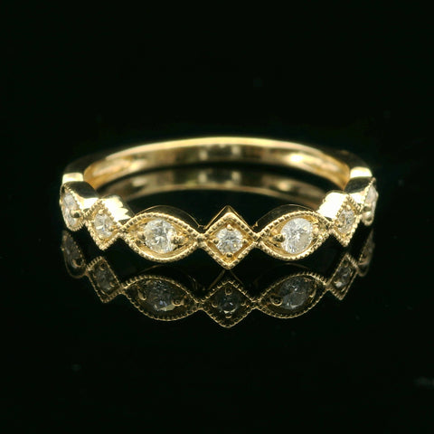 This delicate band ring showcases a series of round cut 1/6 CTTW diamonds set in 14K yellow gold. The diamonds are set along the band, creating a continuous sparkle. Ideal as a wedding band, anniversary...