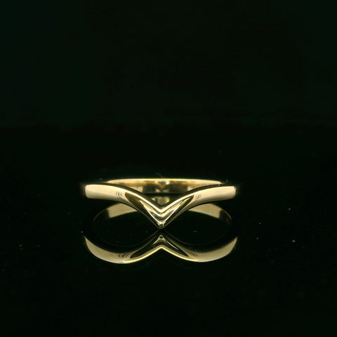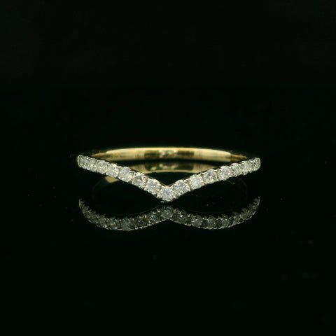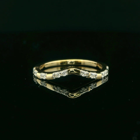 Exquisitely crafted, this 10K yellow gold band ring features a delicate V shape, channel-set with .20cttw round cut diamonds. The brilliant cut and fine setting accentuate the sparkle, making this an elegant piece for everyday...