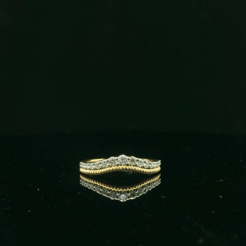 Elevate your elegance with this exquisite 14k yellow and white gold band ring. This piece features a delicate row of .15cttw brilliant round cut diamonds, perfectly set to enhance their natural sparkle. This fine jewelry...