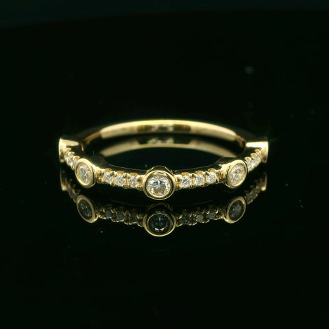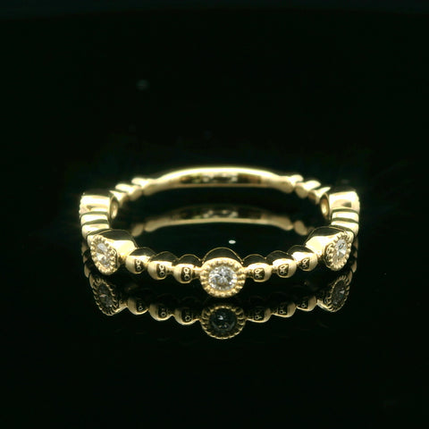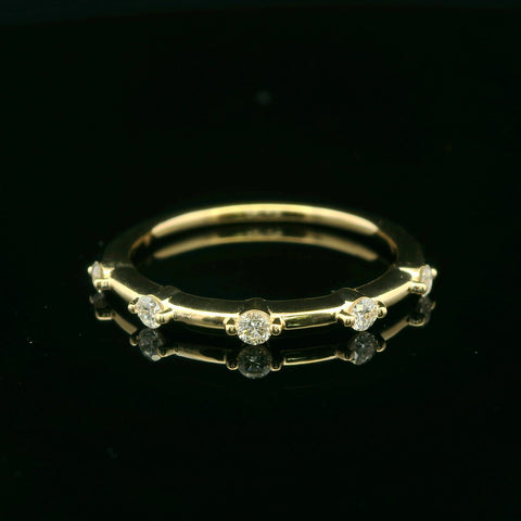 This delicate band ring showcases a series of round cut 1/6 CTTW diamonds set in 14K yellow gold. The diamonds are set along the band, creating a continuous sparkle. Ideal as a wedding band, anniversary...