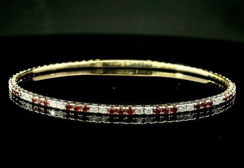 This exquisite 14k yellow and white gold bracelet showcases a stunning combination of radiant rubies 0.80 cttw and sparkling diamonds, set in a sleek gold band. 0.36 cttw. Perfect for adding a touch of sophistication...