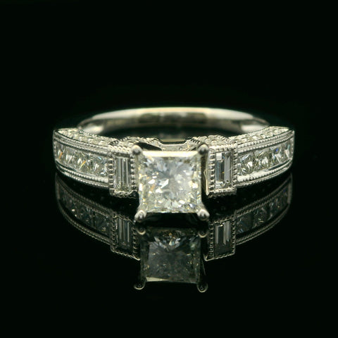 Exquisite multistone ring showcasing a brilliant cut princess diamond with a total of .75CTTW. Crafted in platinum, this ring features a classic design, perfect for adding a touch of timeless sophistication to any ensemble. Its...