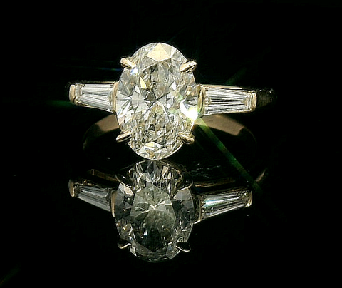 This stunning 14k diamond ring features a brilliant oval-cut center stone, flanked by two baguette diamonds on either side. 2.42 cttw. The exquisite craftsmanship and timeless design make it the perfect symbol of elegance and...