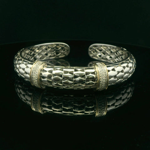 This exquisite bangle bracelet features an intricate woven design in sterling silver, accented with elegant 14k yellow gold details. Round brilliant cut diamonds weighing .52ct are set in the silver framework, adding a touch of...
