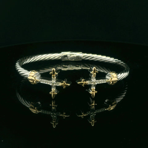 This sophisticated bangle features twisted Italian sterling silver cables accented with 14k yellow gold loops, creating a striking contrast. Each end of the bracelet is detailed with a geometrically designed setting, encrusted with round cut,...