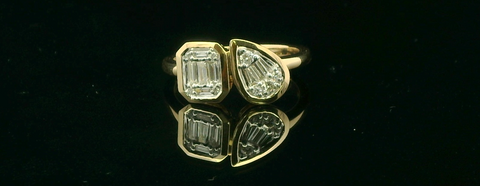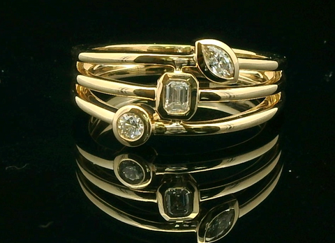Embrace modern elegance with this 14k yellow gold multistone ring. The band showcases an exquisite arrangement of .24 cttw brilliant cut diamonds in varying shapes, set in a unique layered design. A stunning piece that...