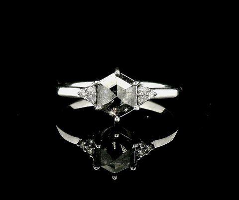 This exquisite 14k ring features a unique hexagon-shaped salt and pepper diamond at its center (0.73cttw), surrounded by smaller sparkling stones. 0.78 cttw. The sleek silver band adds a touch of modern elegance, making it...