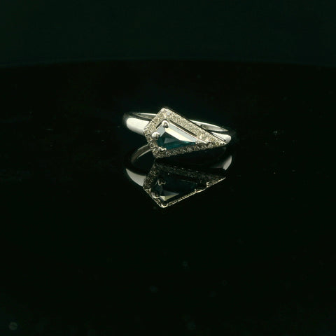 Exquisitely crafted in luminous 14k white gold, this ring features a mesmerizing .74 ct Blue Irradiated Salt and Pepper Kite Cut Diamond. Its surrounded by .09ct diamonds.