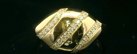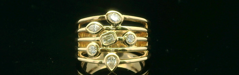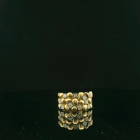 This statement multistone ring features a meticulously crafted design in radiant 14kt yellow gold. Multiple rows of round brilliant cut diamonds embellish the contours, creating an eye-catching sparkle. The arrangement of the stones complements the...