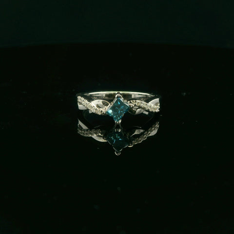 Exquisite ring crafted in lustrous 14k white gold featuring a captivating clover cut Irradiated Blue Diamond Center. The intricate design and fine craftsmanship make this ring a timeless treasure, perfect for adding a touch of...