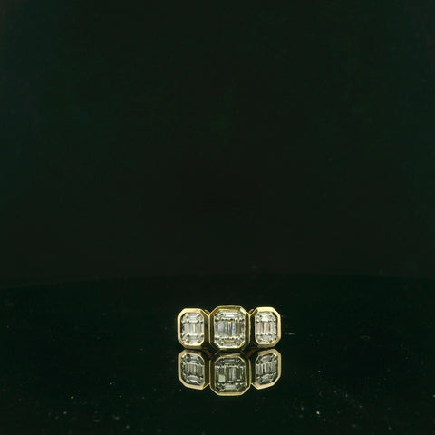 Exquisitely crafted, this ring features a trio of Baguette cut diamonds set in warm 14k yellow gold. The cutting style enhances the diamonds' inherent brilliance, making this ring a statement of refined elegance.