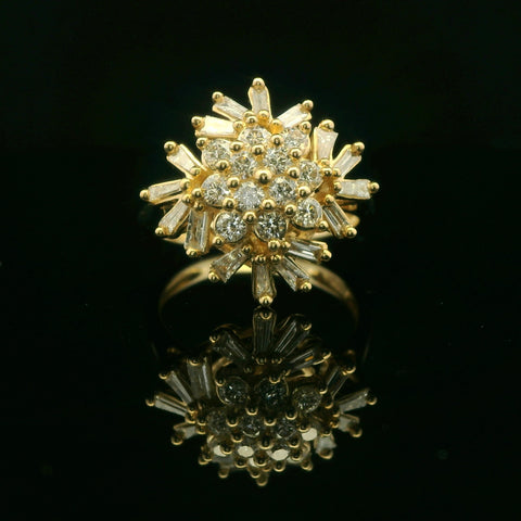 This striking cocktail ring features a floral burst design crafted in 10k yellow gold. The 1 cttw diamond arrangement showcases a cluster of round-cut and baguette diamonds, their facets catching the light with every movement....