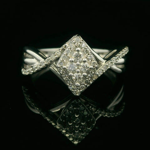 Exquisitely crafted, this .25CTTW ring features a cluster of round brilliant cut diamonds set in a 10K white gold. The diamonds, arranged in a captivating array, create a mesmerizing sparkle. The design showcases a blend...
