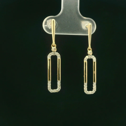 Elevate your style with these captivating 14k yellow gold dangle earrings. The design features a sleek, elongated silhouette adorned with round brilliant-cut diamonds totaling .20ct. These earrings are perfect for adding a touch of modern...