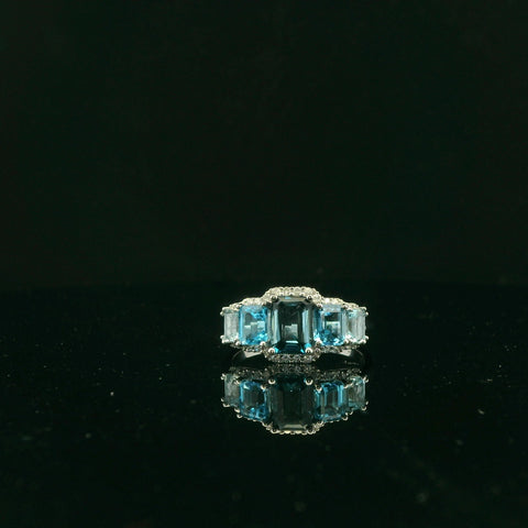 Indulge in timeless elegance with this 14k white gold ring. Featuring a stunning array of Blue Topaz and Diamonds, the ring emanates a refreshing blue hue. The step cutting style accentuates the gemstone's clarity, creating...