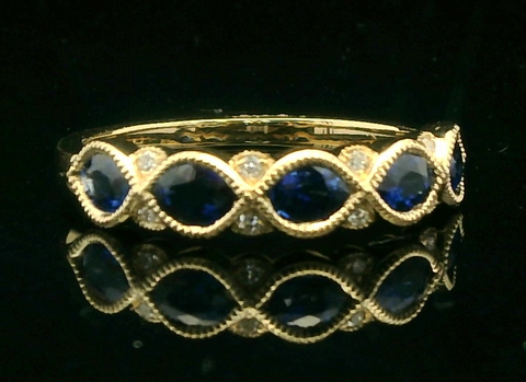 Indulge in the allure of this resplendent 14k yellow gold multistone ring. Featuring 1.06 ct polished, deep blue sapphires, each stone radiates a captivating velvety luster, creating a harmonious blend of color and sophistication. A...
