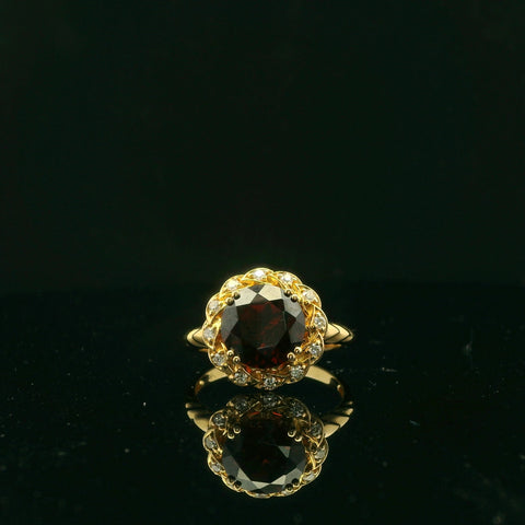 Indulge in the allure of this exquisite ring, featuring a mesmerizing 3.20ct round garnet with .15ct diamonds. Set in a radiant 14k yellow gold base, this statement piece exudes timeless elegance. The rich, red hue...