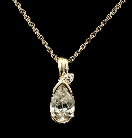 This stunning 10k yellow gold pendant features a 1.91 carat lab grown pear shaped brilliant cut gemstone that catches the light beautifully. Its delicate design is perfect for adding a touch of elegance to any...