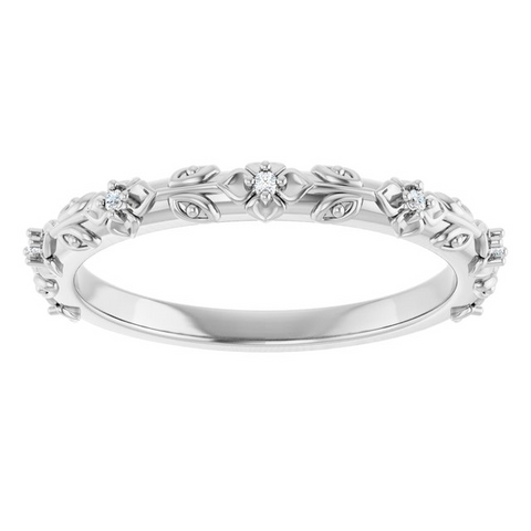 Discover the beauty of this elegant 14k white gold band, featuring a delicate floral design that adds a touch of sophistication to any outfit. 0.03 cttw natural diamonds. Perfect for special occasions or everyday wear,...