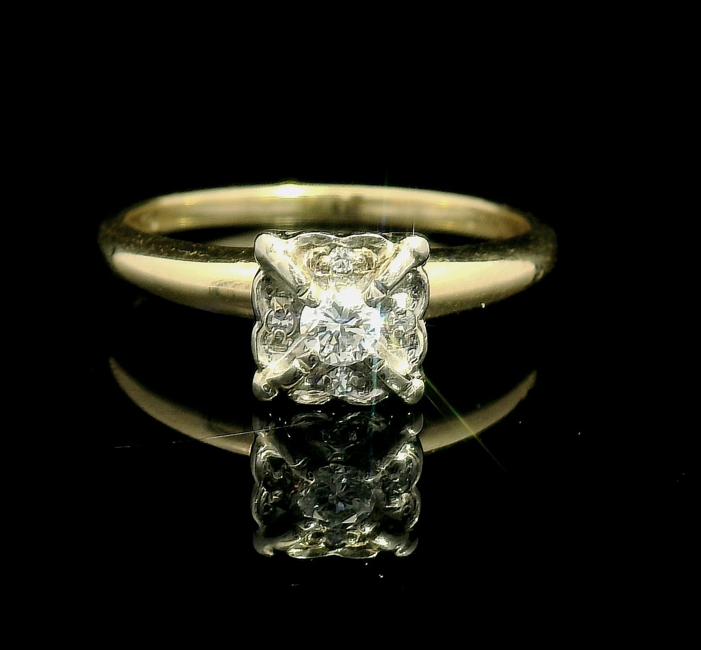 This is a solitaire ring featuring a central round cut diamond (0.12ct), secured in a four-prong setting. The diamond exhibits high clarity and transparency, contributing to its brilliance. The band is composed of 14k yellow gold, characterized by a polished finish, enhancing the overall aesthetic of the piece. The ring's design is simple yet elegant, emphasizing the central gemstone. The overall symmetry of the ring is very good, and the polish is also rated as very good, reflecting quality craftsmanship. 0.14cttw.