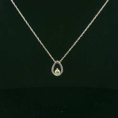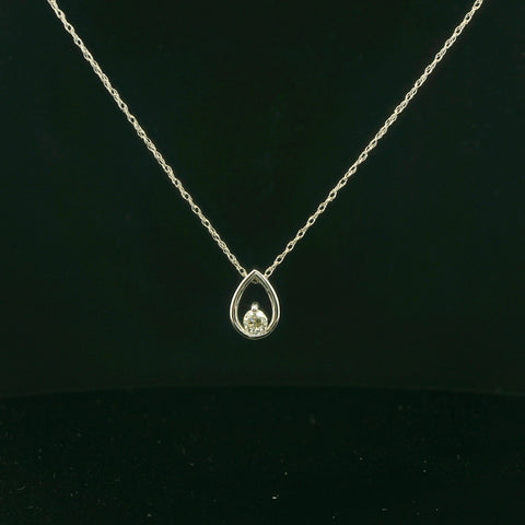 Exquisitely crafted in 14k white gold over silver, this delicate diamond necklace showcases a 0.10 ct round brilliant cut diamond. The pendant's pear shaped design suspends gracefully from a fine chain, creating a timeless piece...