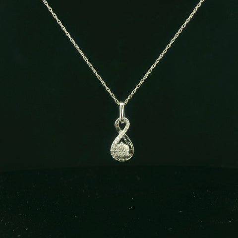 Exquisitely crafted, this charm necklace features a delicate infinity design in 14k radiant white gold. The pendant showcases a cluster of .08 cttw round brilliant cut diamonds, offering exceptional sparkle and fire. This elegant necklace...