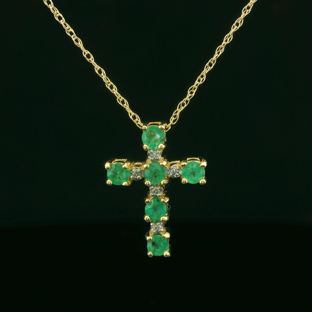 Exquisite 10k yellow gold charm necklace featuring a cross pendant adorned with vibrant green emeralds and diamonds. This pendant boasts a suspended vertically orientation, embodying elegance and refined style.