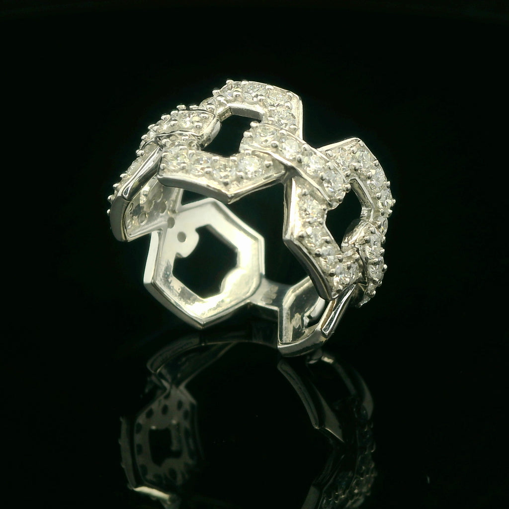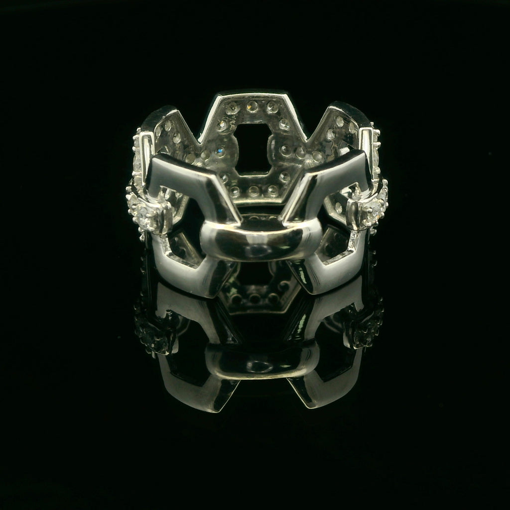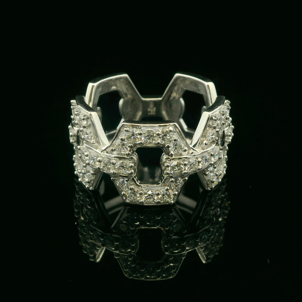 Indulge in the captivating allure of this sterling silver ring, meticulously crafted in a bold, link design. The sterling silver finish enhances its contemporary aesthetic, while the stunning 1.4 cttw lab grown round diamonds set in perfect symmetry exude exceptional fire and scintillation. A statement piece showcasing exquisite craftsmanship and timeless elegance.
