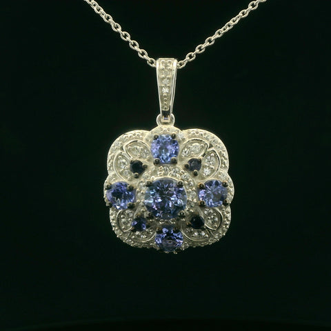 Elevate your style with this exquisite necklace, featuring a flower motif pendant crafted from lustrous sterling silver. The pendant is adorned with a cluster of round cut tanzanite gemstones, displaying a captivating bluish purple hue...