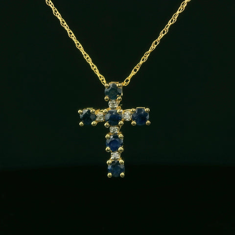 Exquisite 10k yellow gold charm necklace featuring a cross pendant adorned with deep blue genuine sapphires and diamonds. This pendant boasts a suspended vertically orientation, embodying elegance and refined style.