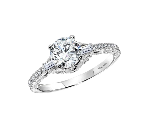 14k white gold, 0.52 carat total weight baguette semi-mount with CZ center (designed for a 1.0 carat round brilliant center)