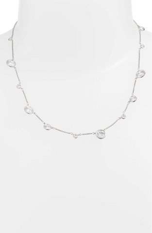 Mixed-size bezel-set cubic zirconia twinkle along a classic station chain that can be worn short or long thanks to an easy-to-adjust slide bead.28" longest length Adjustable slide closure 14k-gold plate or rhodium plate/cubic zirconia Imported