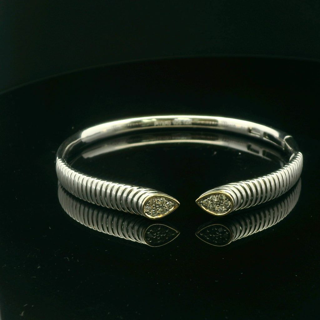 Elevate your wrist with this exquisite Italian Silver bangle, a seamless blend of modern design and classic elegance. The open-ended design is enhanced by the subtle shimmer of diamonds set in 14k yellow gold bezels, creating a refined and timeless aesthetic. This bangle is perfect for adding a touch of sophistication to any ensemble.