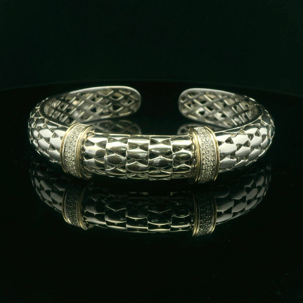 Elevate your style with this exquisite bangle. Crafted from lustrous silver and accentuated with 14K yellow gold accents, this piece exudes sophistication. The design showcases a front facing orientation and a horizontally placed profile, making it a perfect fit for any occasion. It features 1/3CTTW of brilliant cut round diamonds adding a touch of timeless elegance.