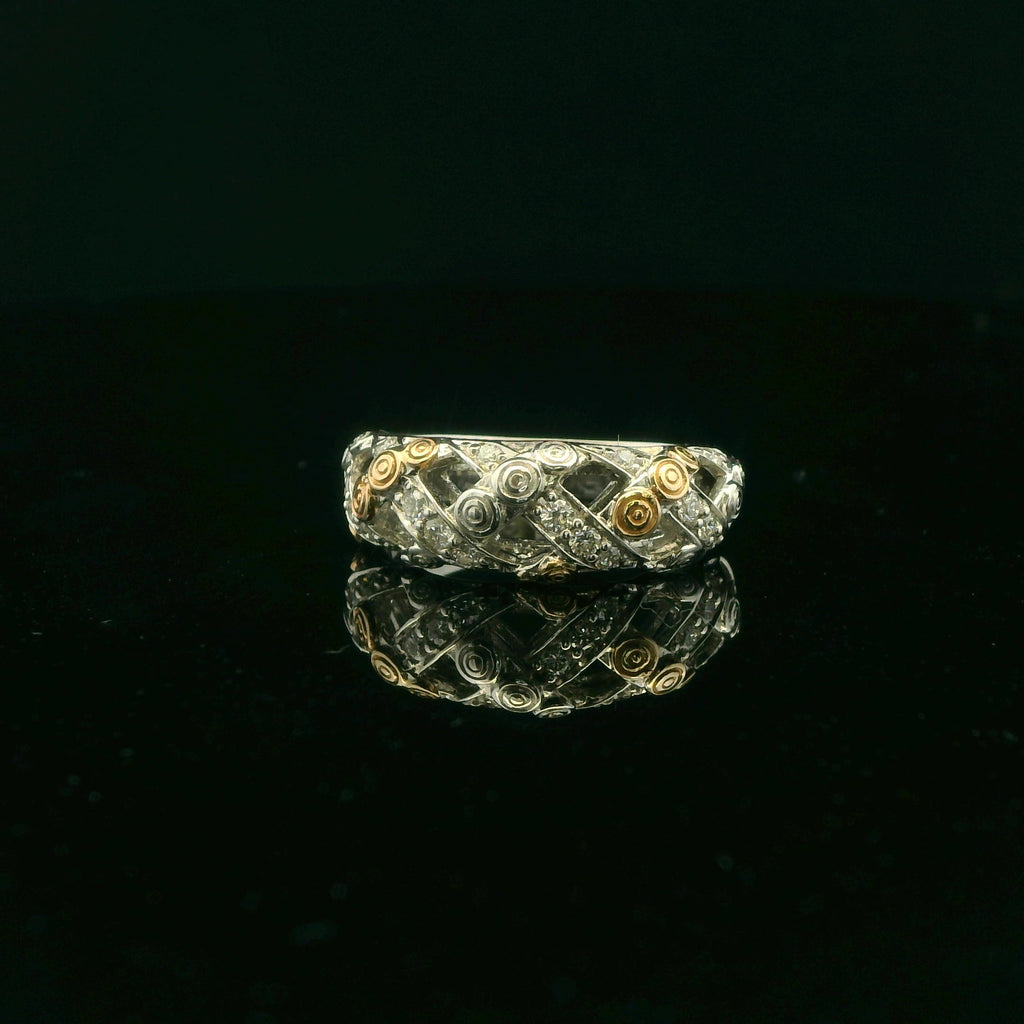 Elevate your style with this stunning Italian Silver and 14k yellow gold band ring. The intricate design features interwoven patterns and brilliant round cut diamonds that exude sophistication. Its exquisite craftsmanship and unique detailing make it a must have accessory for any occasion.