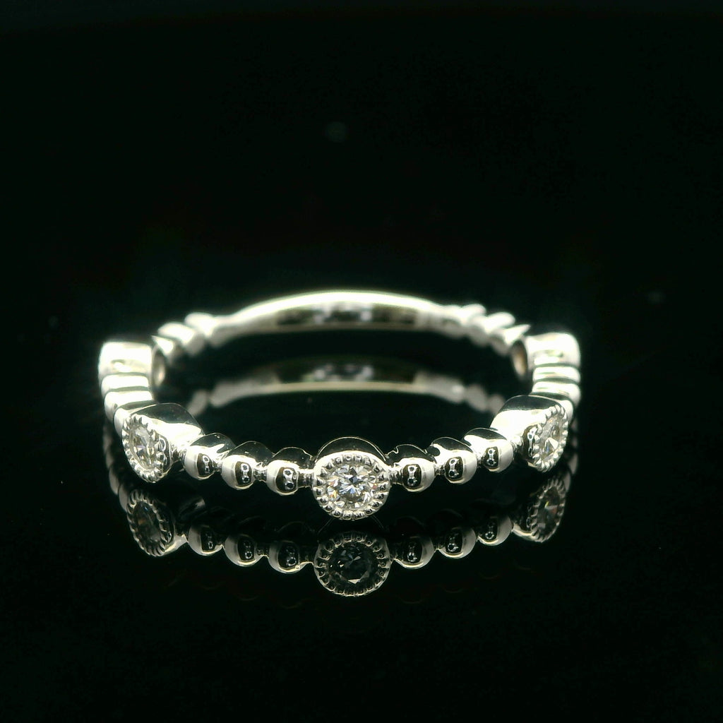 This delicate band ring showcases a series of round cut 1/6 CTTW diamonds set in 14K white gold. The diamonds are set along the band, creating a continuous sparkle. Ideal as a wedding band, anniversary gift, or a chic addition to any jewelry collection, this ring offers timeless elegance and refined style.