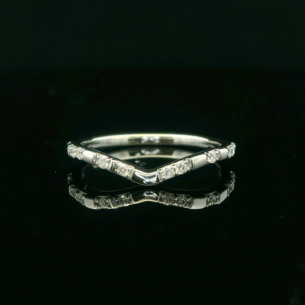 Exquisitely crafted, this 14K white gold band ring features a delicate chevron silhouette, channel-set with 1/10CTTW of diamonds. The pristine white gold setting enhances the sparkle, creating an elegant and modern aesthetic. Designed for comfort and style, this band ring is a timeless addition to any jewelry collection, perfect as a minimalist statement piece or layered with other rings.