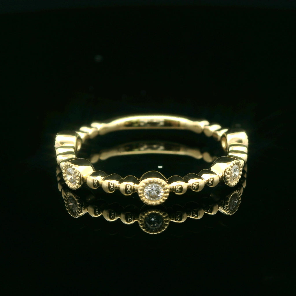 This delicate band ring showcases a series of round cut 1/6 CTTW diamonds set in 14K yellow gold. The diamonds are set along the band, creating a continuous sparkle. Ideal as a wedding band, anniversary gift, or a chic addition to any jewelry collection, this ring offers timeless elegance and refined style.
