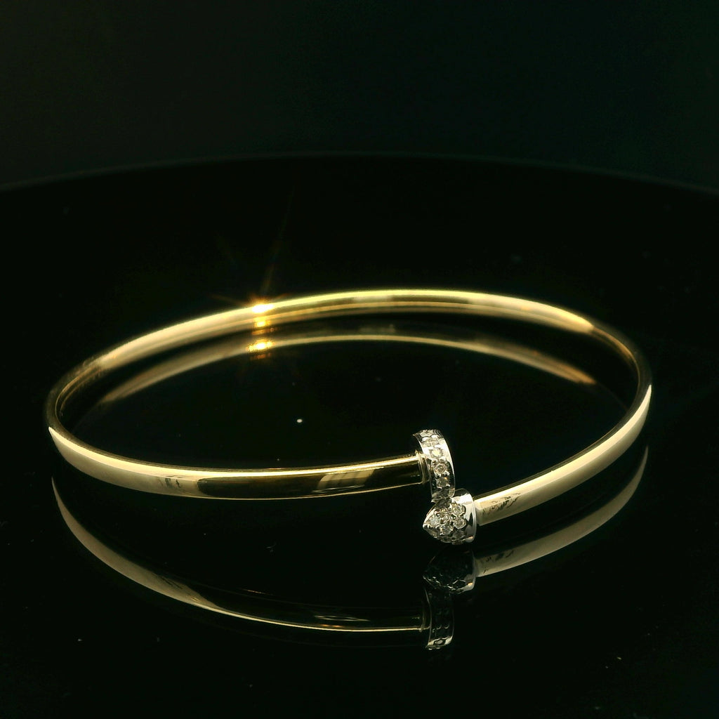 Elevate your style with this sleek 14k yellow gold bangle. This fine jewelry showcases a modern nail-head design accented with .10 cttw round cut diamonds, known for their brilliant sparkle. The seamless construction and polished finish ensure a comfortable and sophisticated addition to any ensemble, perfect for both day and evening wear.
